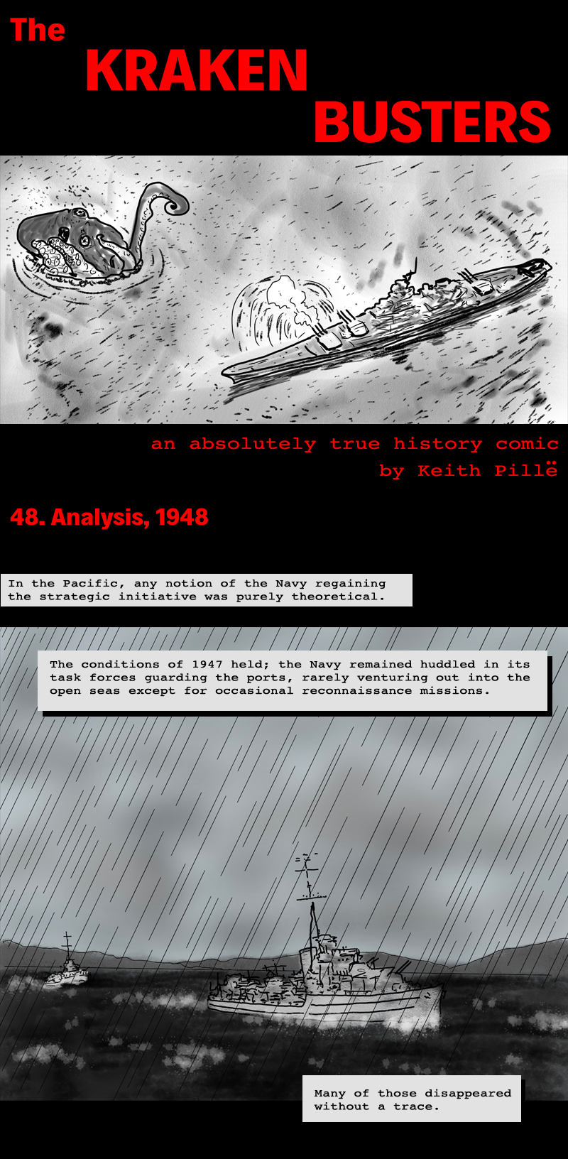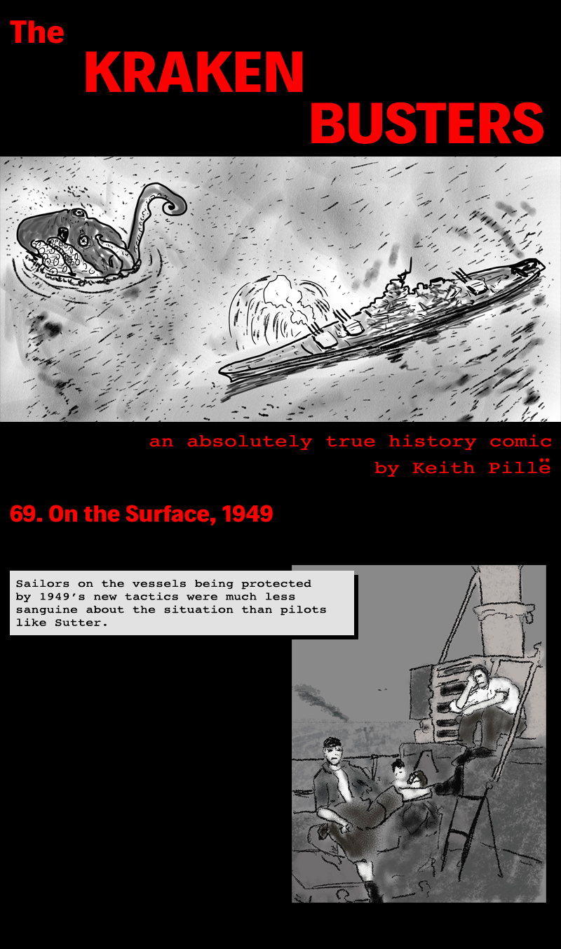 So you’ve probably heard me talk about the book I wrote about the US Navy fighting sea monsters in the 1940s, and then the subsequent podcast adaptation that I did of it. Well, I have a terminal case of Cartoonist Brain, so with a story like that sloshing around in my head, it was inevitable that I’d start getting ideas about different ways that it could be presented visually. And this started to drive me nuts.