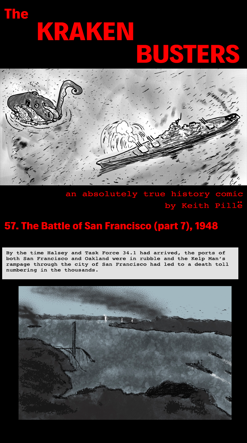So you’ve probably heard me talk about the book I wrote about the US Navy fighting sea monsters in the 1940s, and then the subsequent podcast adaptation that I did of it. Well, I have a terminal case of Cartoonist Brain, so with a story like that sloshing around in my head, it was inevitable that I’d start getting ideas about different ways that it could be presented visually. And this started to drive me nuts.